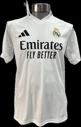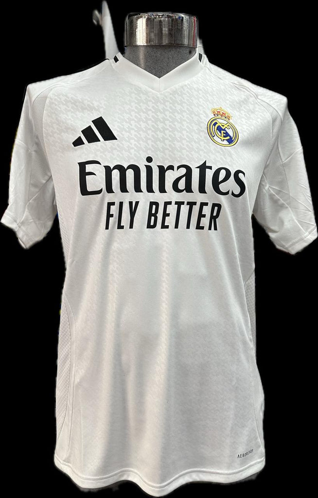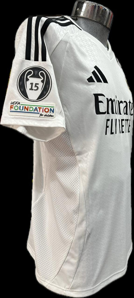 Jersey oficial del equipo Real Madrid de la temporada 24-25 con el estampado #9 de Mbappé junto al parche de las Champions.